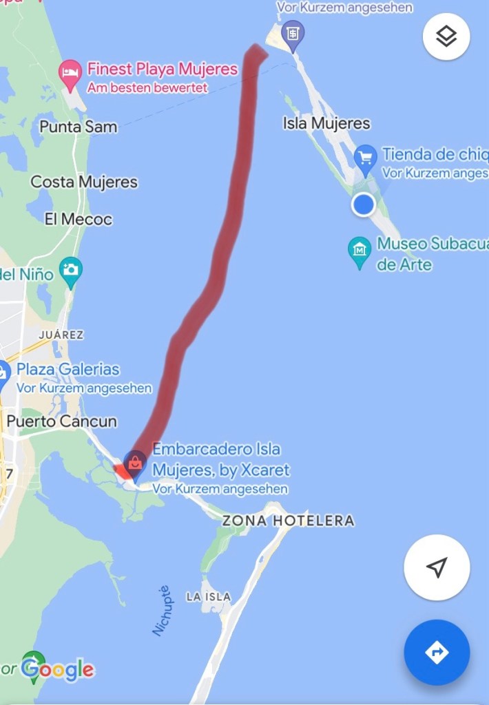 Um 18.00 sind wir dann auch los, da ich die Fähre zu meiner nächsten Station, Isla mujeres (zu deutsch Fraueninsel), nehmen musste. Isla mujeres ist mit der Fähre in nur etwa 30 Minuten von Cancún zu erreichen. Für ein Rundticket zahlt man etwa 30 bis 35 Euro. Das Ticket kann man ganz einfach am Terminal kaufen wo die Fähre ablegt.