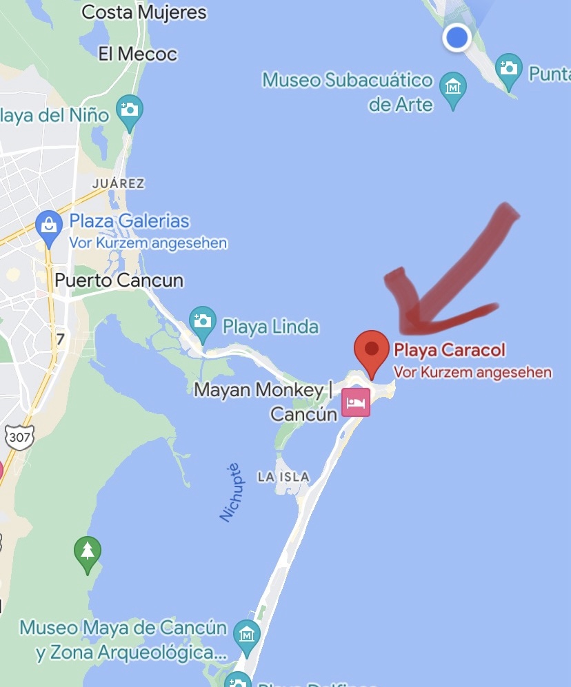 Ich hatte mich dort mit Estefania, die ich bei der Chichen Itza Tour kennengelernt hatte verabredet. Da dies mein letzter Tag in Cancún war, musste ich meine komplette Ausrüstung zum Strand schleppen. Daher haben wir uns entschieden ein Uber zu nehmen für knapp 150 Pesos. Kurz vor der Abfahrt ist dann noch Sam mit dazukommen und somit sind wir zu 3. an den Strand. Dort angekommen haben wir uns mit Estefania getroffen und haben etwas gegessen und für mich gabs Kaffee 😊.