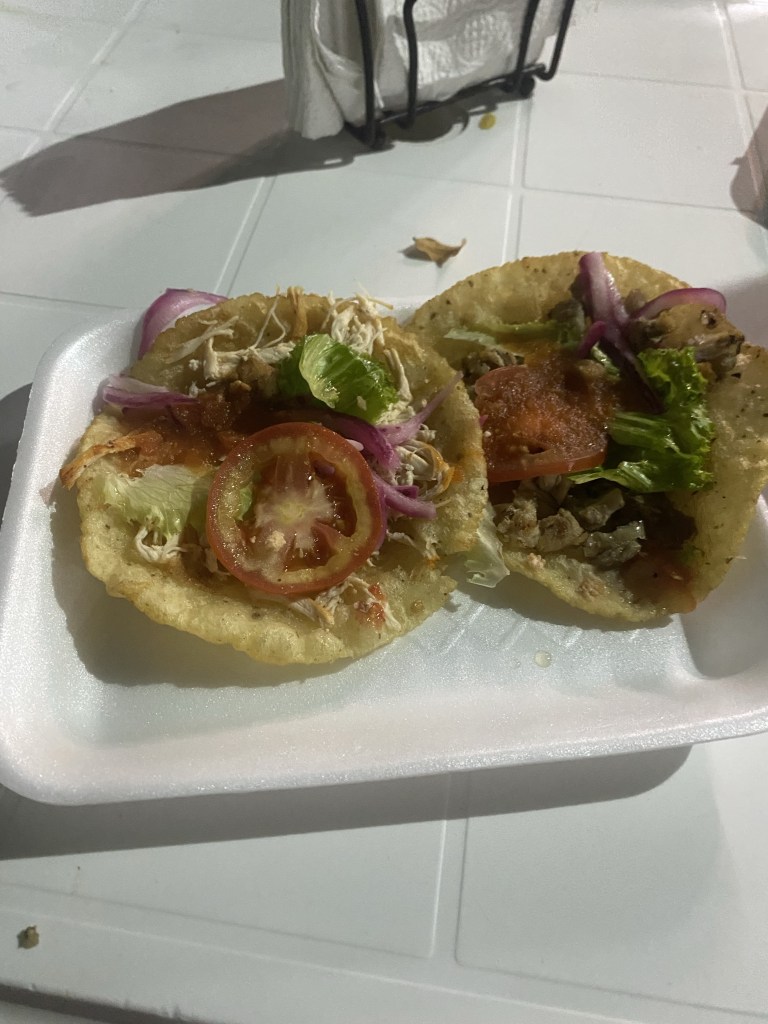 Jetzt hatten wir alle Hunger und Chris hat uns zu einer kleinen StraĂenecke navigiert wo es einheimisches Streetfood zu lokalen Preisen gibt. Die Dame mit dem Stand fĂ€hrt dort jeden Abend um 18:00 Uhr hin, baut ihren Stand auf und bleibt bis alles ausverkauft ist. Bei ihr haben wir dann Tacos fĂŒr 20 Pesos gekauft und die waren echt lecker.