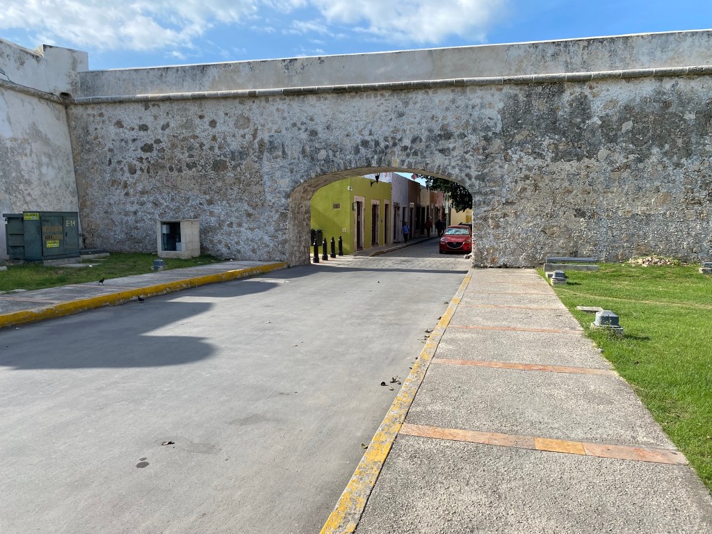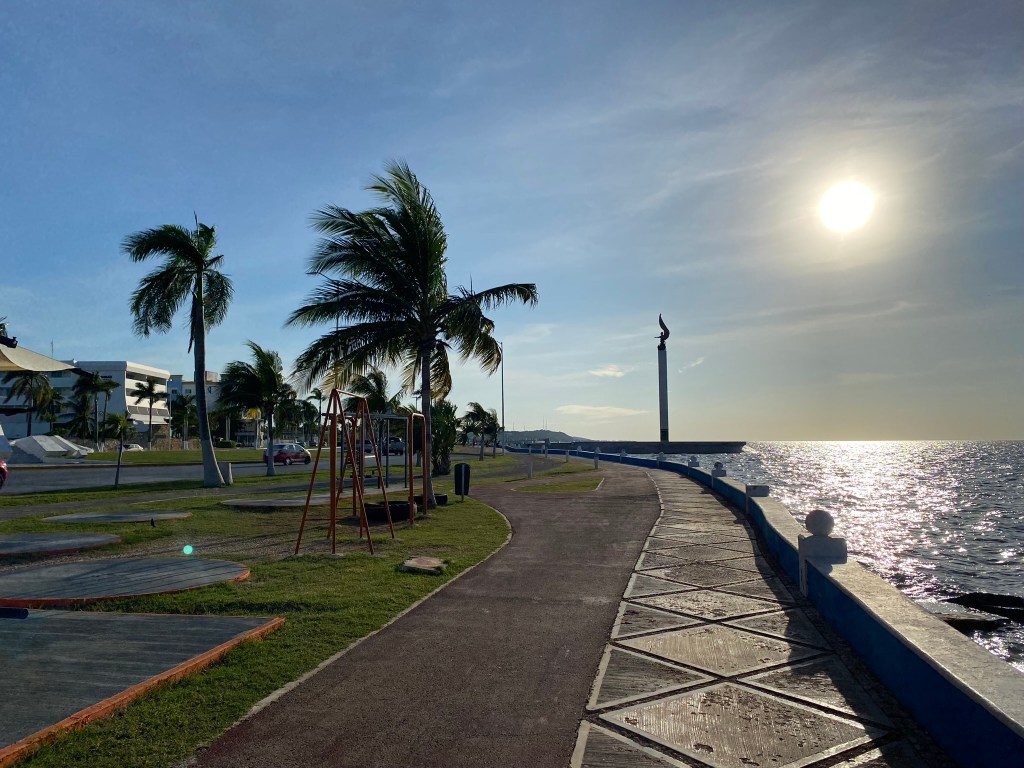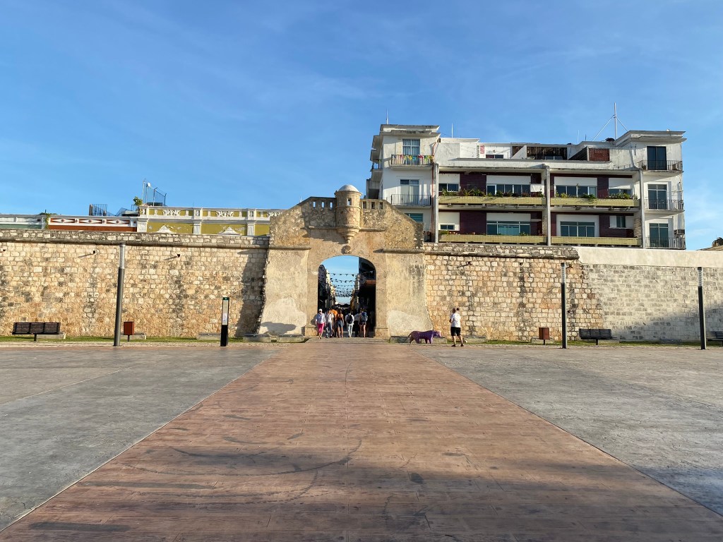 Um 2.00 Uhr nachts wollten wir dann einen 6-stuendigen Nachtbus von Campeche nach Palenque nehmen. Campeche war also eigentlich eher so ein Not-Zwischenstop und wir haben auch nicht wirklich viel von der Stadt erwartet, da uns von vielen Leuten gesagt wurde, dass es dort eigentlich nicht viel zu sehen gibt. Vielleicht noch ein paar kurze Infos an dieser Stelle zur Stadt: Campeche liegt an der Westkueste vom Golf von Mexikko, ist die Bundeshauptstadt des gleichnamigen Staates Campeche und zaehlt mit ca. 200.000 Einwohnern eher zu den kleineren Staedten in Mexiko. Frueher war Campeche eine der wichtigsten Hafenstaedte der Yucatan-Halbinsel und wurde mehrmals von Piraten heimgesucht. Auf Grund der haeufigen Angriffe wurde eine Befestigungsanlage um die Stadt herum gebaut. Diese steht auch immer noch und umgibt sozusagen das historische Zentrum der Stadt. Als wir in Campeche angekommen sind haben Roberto und ich uns genau zu diesem Stadtteil begeben, da es mit Ausnahme des historischen Zentrums wirklich nichts sehenswertes in Campeche zu sehen gibt. Wir mussten also mit unseren Rucksaecken von der ADO-Busstation zum Hafenzentrum laufen. Von der selben Busstation sollte dann auch unser Bus abfahren, der uns nach Palenque bringen sollte. Am Wasser angekommen waren wir dann ueberrascht wie schoen die Stadt in diesem Bereich aussieht.