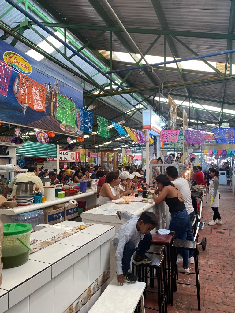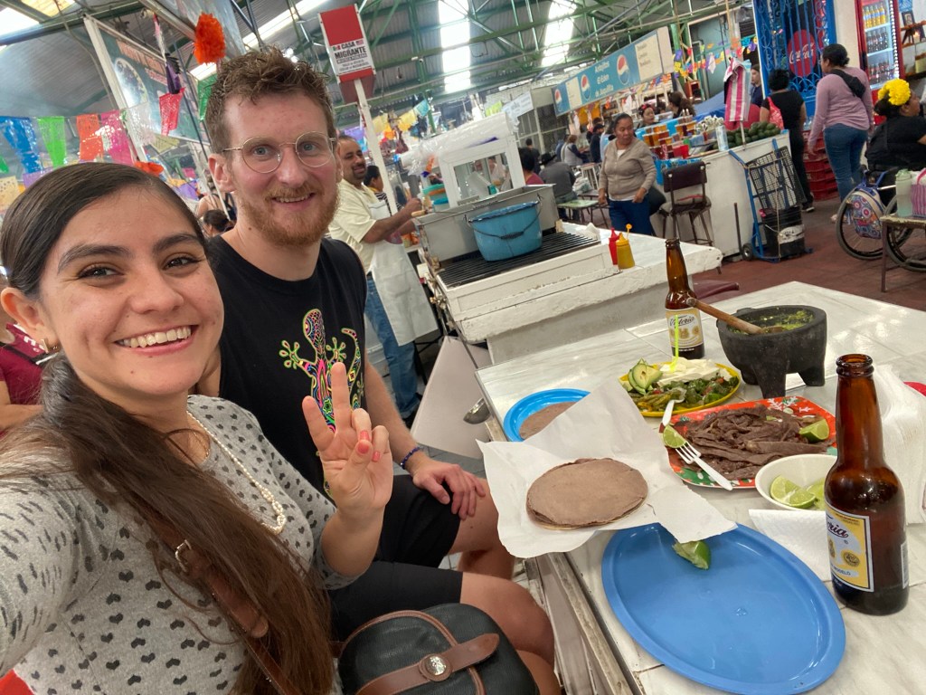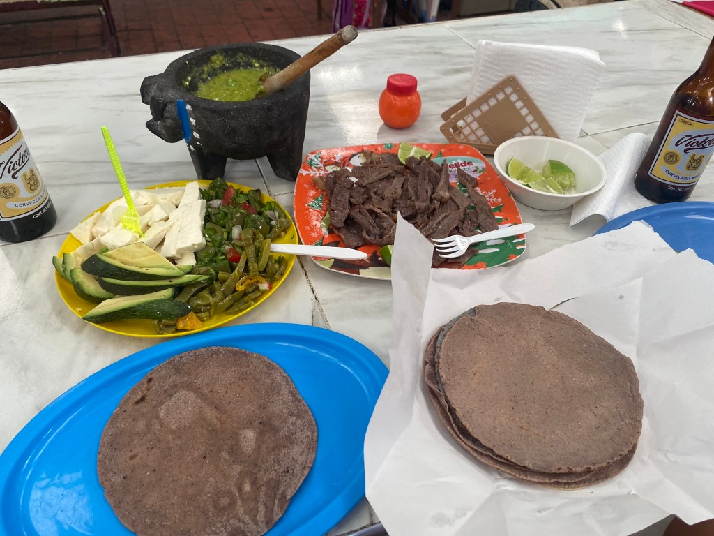 Das erste was wir nach Ankunft in Atlixco gemacht haben, war eine Runde auf dem Markt zu drehen um nach einem Frühstück Ausschau zu halten und die Auswahl hier war richtig groß und jeder hatte großes Interesse, dass ich zu ihnen komme um zu essen :). Da ich mich überhaupt nicht entscheiden konnte, hat Estefania etwas für uns rausgesucht. Ich weiß leider nicht mehr genau wie man dieses Essen nennt, aber im Grunde waren es Tortillas aus schwarzem Mais, gebratenes Fleisch mit einem speziellen Käse und eingelegtem Gemüse. Im Grunde genommen isst man das alles wie ein Taco, aber es ist halt kein klassischer Taco. Es war auf jeden Fall gut.
