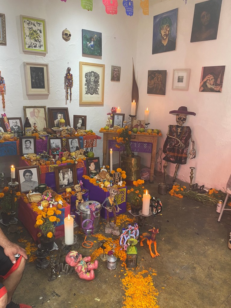 Um auf den Hügel zu gelangen mussten wir vom Stadtzentrum aus einen Fußmarsch von circa 40 Minuten hinter uns legen. Wir sind immer wieder an Wohnungen vorbeigekommen, die man betreten konnte und in denen ein kleiner Schrein für die Toten aufgebaut war. Draußen vor dem Eingang der Tür war eine Spur aus orangenen Blumen, den Cempasúchil, ausgelegt, um den Toten den Weg zum Schrein zu weisen. Auf den Schreinen legen die Mexikaner alles mögliche was derjenige Verstorbene gerne gehabt hat. Somit sehen die Schreine immer etwas unterschiedlich aus. Was sie aber alle gemeinsam haben sind die Cempasúchil Blüten, die überall um den Schrein herum verteilt sind.