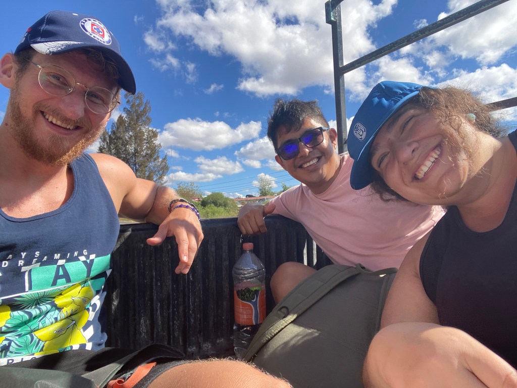 Allerdings war es nicht möglich einen vernünftigen Preis für die 20 minütige Fahrt mit dem Taxi zu verhandeln. 300 Pesos für eine Fahrt erschien uns doch etwas viel und dass obwohl Angel, der sogar Mexikaner ist und aus Mexico City kam, sich echt Mühe mit dem Verhandeln gegeben hat. Nachdem wir schon fast aufgegeben hatten, haben wir eine nette Familie getroffen, die zwar nicht nach Santiago Apoala fahren wollten, uns aber angeboten habt uns ins 1 Stunde entfernte Tamazulápam del Progreso mitzunehmen. Die Eltern wollten mit ihrem Sohn zu einem kleinen See baden fahren und so sind wir mit den 3en gemeinsam auf der Ladefläche ihres Pickups losgefahren. Auf der Autofahrt durch die Sierra Norte von Oaxaca konnten wir noch einmal ausgiebig die schöne Landschaft von Oaxaca genießen. Die Badestelle lag etwas außerhalb der Stadt, aber zum Glück hat uns die Familie nach dem Baden mit in die Stadt genommen. Hier haben wir die 3 als Dankeschön für die freie Fahrt noch auf ein paar Tacos eingeladen und sind dann gegen 18.00 Uhr abends mit dem Colectivo zurück nach Oaxaca gefahren.