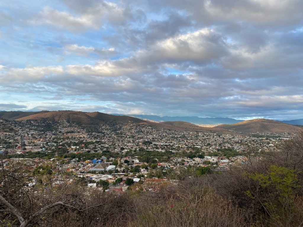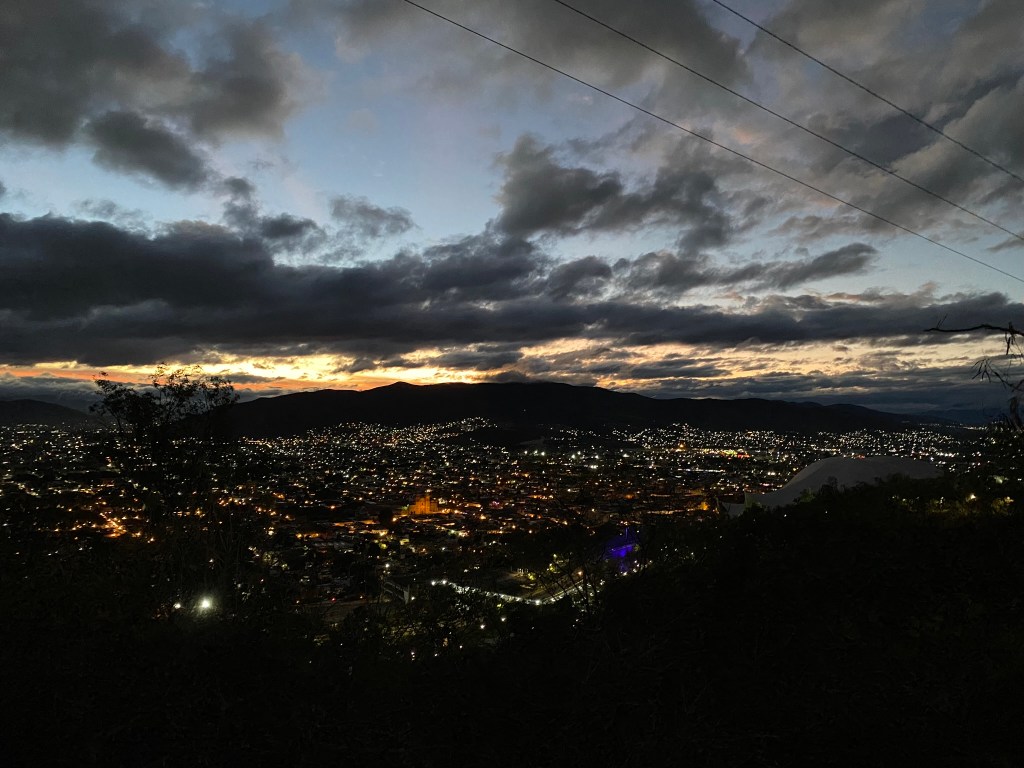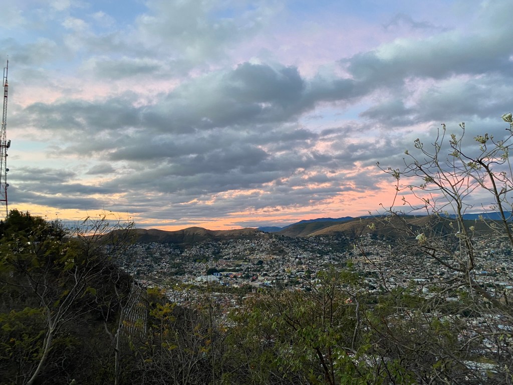Eine Sache, die ich in Oaxaca auf jeden Fall noch machen wollte bevor ich weiter reise, war den Sonnenaufgang auf dem Auditoria Guelaguetza zu sehen. Das Auditoria ist ein beliebter Veranstaltungsort, welcher sich auf Grund seiner Lage oberhalb der Stadt auch gut als Aussichtspunkt über die Stadt eignet. Da die Sonne um 6.40 aufgeht, musste ich bereits um 5.30 vom Hostel los und habe sogar noch mit dem Volunteer Ricardo und einem Mädchen aus Indien 2 Mitstreiter gefunden, die sich in der Früh dort zusammen mit mir hochquälten. Am Fuß des Hügels angekommen ging es dann zuerst eine Treppe hoch und dann über eine Straße weiter nach oben. Oben angekommen konnten wir dann einen wundervollen Blick auf die Stadt genießen und auch der Sonnenaufgang war trotz einer dicken Wolkendecke schön anzusehen.