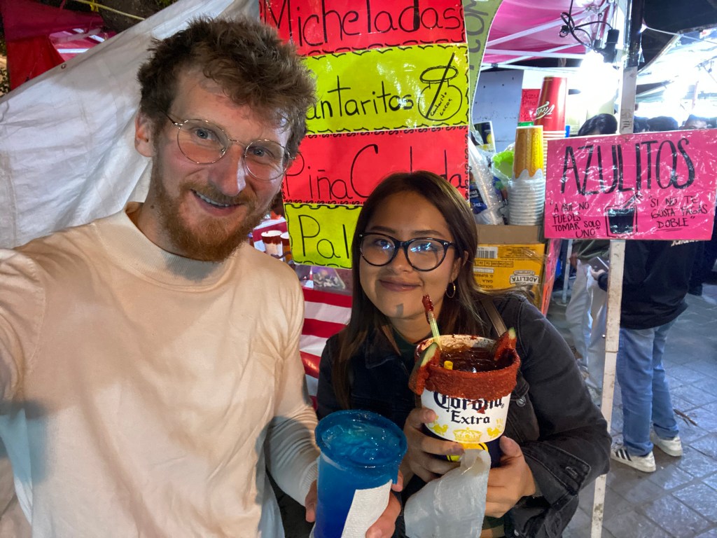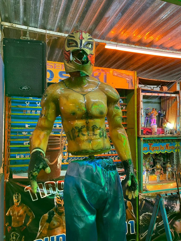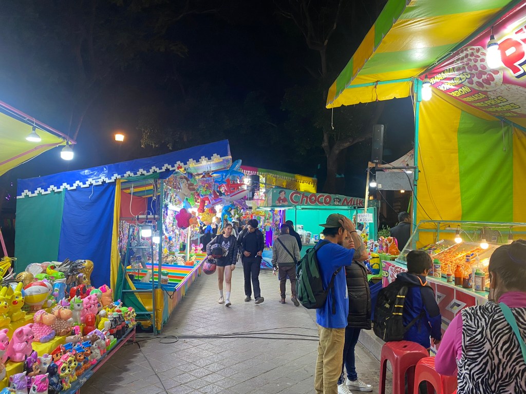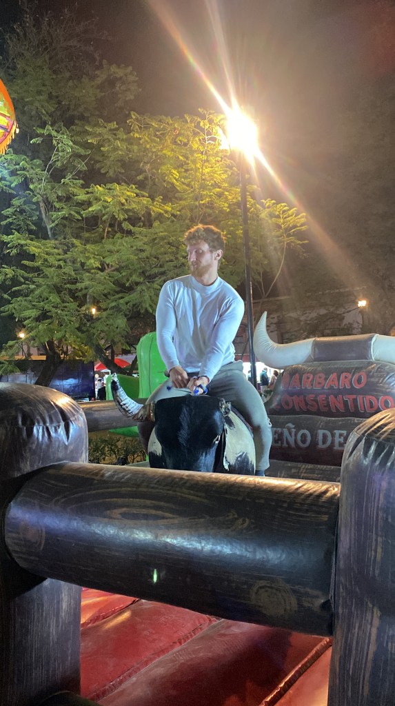 Am 14.12.23 bin von meinem Ausflug nach Puerto Escondido wieder zurück nach Oaxaca gekommen und habe mich hier noch einmal bis ein Tag vor Weihnachten im Maka Hostel eingenistet. Ich hatte also noch etwa 1 Woche Zeit hier in Oaxaca. Nachdem ich mich erstmal 2 Tage von dem drückenden Klima in Puerto Escondido erholen musste, habe ich zusammen mit Vania einen Jahrmarkt im Stadtzentrum besucht. Hier gab es alles, was es auch auf deutschen Jahrmärkten gibt. Von Schießbuden, Auto-Scooter, Riesenrad, Bullen-Reiten (ok, das ist vielleicht nicht ganz so deutsch) und diversen Fressbuden konnte man hier alles finden. Nachdem Vania mir ihre Fahrkünste im Auto-Scooter demonstriert hat, sind wir durch die vielen Stände gelaufen und sind letztendlich an einem Stand mit diversen Cocktails stehengeblieben. Hier habe ich das erste mal einen Azulito getrunken. Das ist ein blauer, relativ süßer Cocktail auf der Basis von Vodka, Energy Drink und einem Erfrischungsgetränk, das so ähnlich schmeckt wie Sprite. Danach sind wir noch mit dem Riesenrad gefahren und ich habe mich im Bullenreiten und schießen versucht.