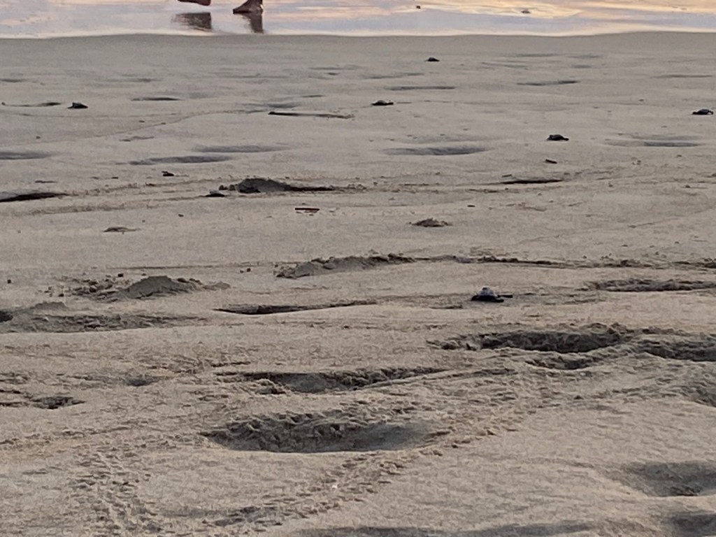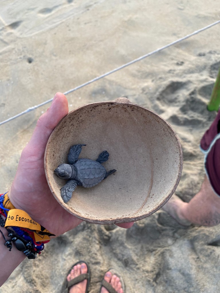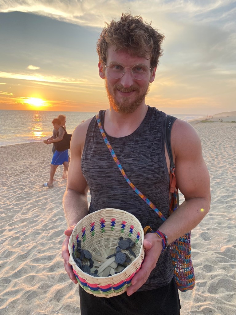 Am darauf folgenden Tag haben wir uns mit Ricardo zum Frühstück verabredet. Ich habe ihn genauso wie Romina im Maka Hostel in Oaxaca City kennengelernt, ist aber 2 Tage nach uns in Puerto angekommen. Nach ein paar Stunden am Strand habe ich mich dann auf den Weg zum Strand von Bacocho gemacht. Hier kann man nämlich jeden Tag um 17:00 Uhr kleine Baby-Schildkröten ins Meer freilassen. Die Aktion wird von einem Naturschutzbund organisiert, der sich um den Fortbestand verschiedener Schildkröten-Arten hier in Puerto kümmert. Für 100 Pesos kann man hier eine kleine Schildkröte ins Meer freilassen. Nach einer kurzen Einführung über die Organisation und über die verschiedenen Schildkrötenarten, die hier brüten hat man dann ein kleines Schälchen mit seiner Schildkröte bekommen. Vor einer Absperrung konnte man diese dann auf dem Satz absetzen und ihr bei ihrem Marsch ins Meer beobachten. Interessant fand ich, dass Schildkröten den Strand an dem sie das Meer betreten am Geruch wiedererkennen und über nach Jahren im Meer es schaffen auf Grund des Geruches wieder genau an dem selben Strand selbst Eier zu legen. Daher war es extrem wichtig, dass man die Schildkröten nicht berührt, da man sonst den so sensitiven Geruchssinn der Tiere beeinflussen könnte. In Kombination mit dem Sonnenuntergang war es schon ein sehr emotionales Erlebnis für mich mit anzusehen wie die kleinen Tiere ihren Weg in das Weg bestreiten mit dem Wissen, dass sie vielleicht in vielen Jahren wieder hierher zurückkehren.