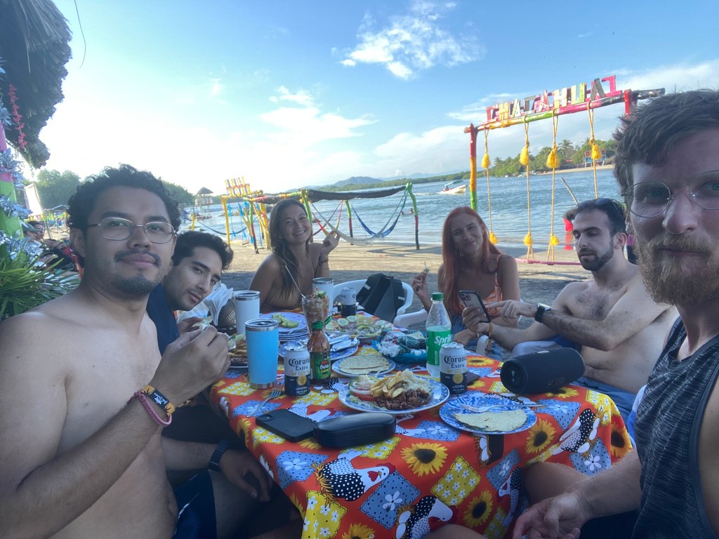 Für den nächsten Tag hatten Romina und ich geplant einen Ausflug in den etwa 1,5 Stunden entfernten Nationalpark von Chacahua zu machen. Zusammen mit Diego, Ricardo, einem Freund der beiden, dessen Namen ich leider vergessen habe und Marion aus Mexico City haben wir uns zusammen in einem Mietwagen auf den Weg gemacht. Chacahua mit seine großen Seen liegt sehr abgelegen von Puerto und ist nur mit einem Boot von El Zapotalito aus, einem kleinen Örtchen direkt am See von Chacahua, zu erreichen. Der Nationalpark ist für seine noch sehr unberührte Landschaft, seinen Seen bekannt und zudem ist dieser Ort auch für Surfer sehr interessant, da hier wohl die Wellen sehr gut sein sollen. Auch übernachten ist hier in dieser abgelegen Region kein Problem, da man sich eine von vielen direkt am Strand gelegenen Hütten mieten kann. Auf Grund seiner abgeschiedenen Lage ist Chacahua auch noch nicht so überlaufen wie Puerto Escondido. Die Bootsfahrt von El Zapotalito aus dauert etwa eine Stunde und ist mit 3000 Pesos relativ teuer. Wenn man hier allerdings mit einer kleinen Gruppe ankommt und sich den Preis teilt ist es schon in Ordnung, da im Preis auch eine Rückfahrt inklusive ist. In dieser Stunde lotst einen der Kapitän des kleinen Bootes durch die vielen kleinen Inseln vom Nationalpark von Chacahua. Für mich war es ein einzigartiges Erlebnis, welches zusammen mit dieser Truppe noch einmal extra Spaß gemacht hat. In Chacahua angekommen, wurden wir dann an einem kleinen Strand mit ein paar Restaurants rausgelassen und haben wir 6 verschiedene Gerichte von Tintenfisch, Cerviche mit Krabben, Fisch und Muscheln gegessen.