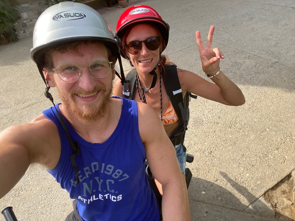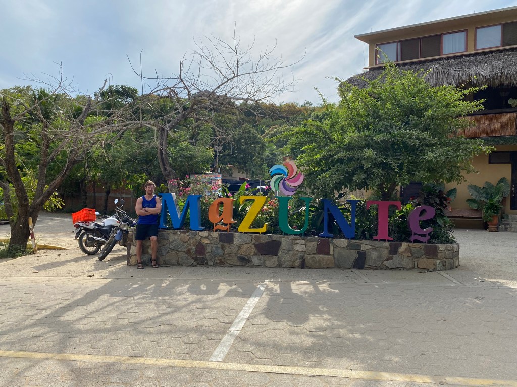 Am Tag darauf, am 11.12.23, hatten Romina und ich uns vorgenommen einen Tagesausflug in das nahegelegene Mazunte zu machen. Mazunte liegt etwa 1.5 Stunden von Puerto Escondido entfernt und ist für seine Strände und sein entspanntes Flair bekannt. Mazunte ist im Gegensatz zu Puerto ziemlich klein und hat nur circa 650 Einwohner. Wir haben uns dazu entschieden mit dem Scooter dort hinzufahren. Zum einem gibt es keine direkte Verbindung von Puerto nach Mazunte und zum anderen wollte Romina mit dem Scooter fahren üben. So haben wir uns für 300 Pesos einen Scooter ausgeliehen und haben uns auf den Weg nach Mazunte gemacht. Die Fahrt dorthin mit dem Scooter hatte schon was an sich. Durch den Fahrtwind lässt sich die hohe Tagestemperatur gut aushalten und auch die Landschaft, die man auf die doch etwas langsamere Art der Fortbewegung mitbekommt war schön anzusehen.