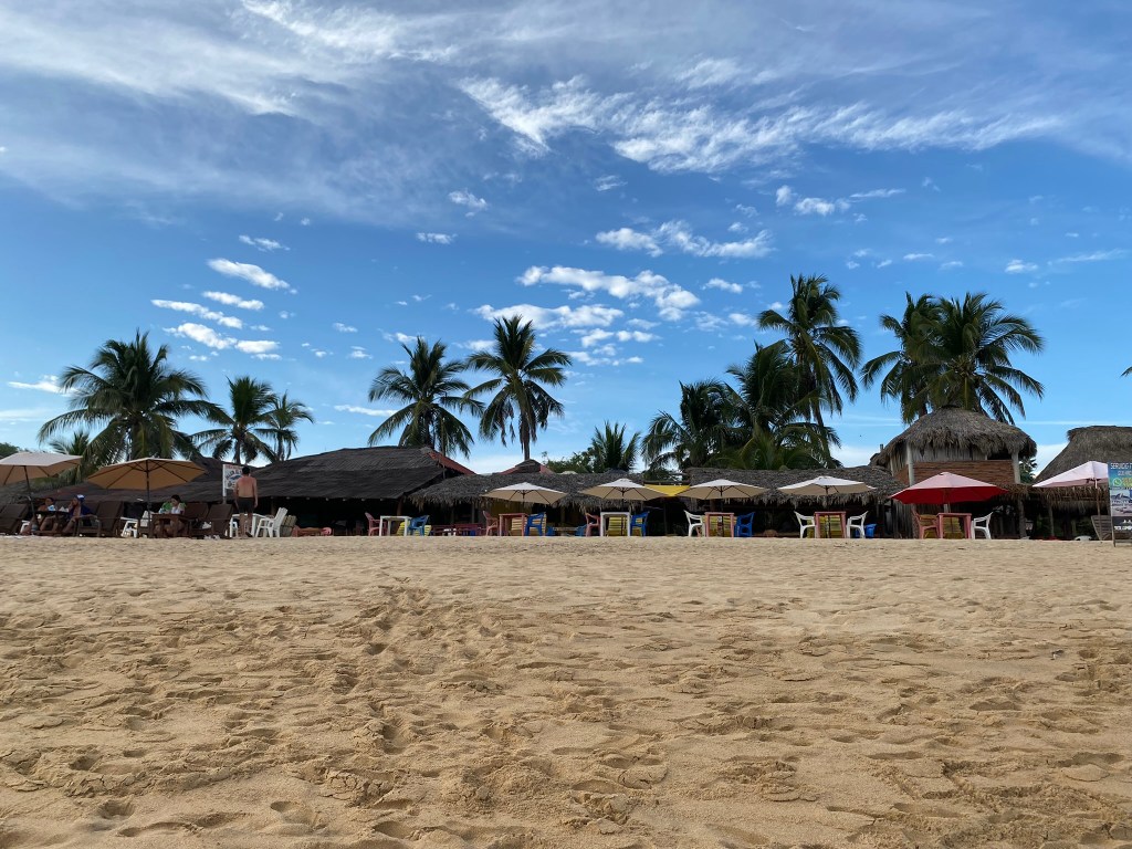 Den nächsten Tag habe ich damit verbracht einen ausgiebigen Spaziergang durch unsere nähergelegene Nachbarschaft zu machen und mich mit der Gegend etwas vertrauter zu machen. Genaugenommen die Region Zicatela. Puerto teilt sich so ein wenig in 3 Bereiche auf. Den nördlichen Bereich, wo auch mehr Einheimische wohnen, den mittleren Bereich Zicatela mit mehr Clubs und den eher entspannten südlichen Abschnitt La Punta, wo man auch die ganzen Surfen antrifft. Hier in Zicatela habe ich das erst mal mitbekommen wie stark die Region am wachsen ist. Fast an jeder Straße hat man mindestens eine Baustelle finden können. Hier werden in Zukunft mehrere duzende Hotels entstehen. Ansonsten war die Region rings relativ ruhig. Das hat mir nicht so wirklich gefallen und nimmt der Stadt auf jeden Fall den Flair einer entspannten Küstenstadt. Außerdem habe ich von den Einheimischen erfahren, dass hier sehr viel Vegetation wie Palmen abgeholzt werden, um für die großen Bauten Platz zu machen. Auch nicht so toll… Nach etwa einer Stunde durch die Straßen von Zicatela (das ist der Stadtbezirk in dem sich unser Hostel befand) habe ich dann eine kleine, wirklich nett angelegte Strandbar gefunden, wo ich mich von meinem Spaziergang in der Hitze bei einem Bier erholte.