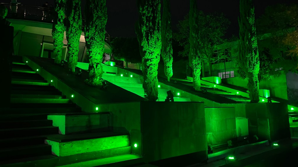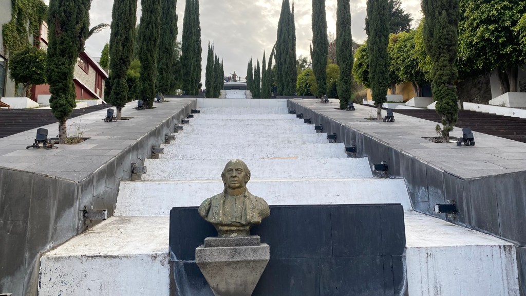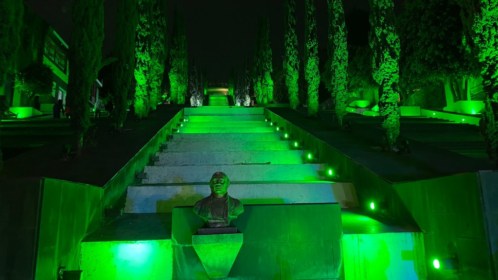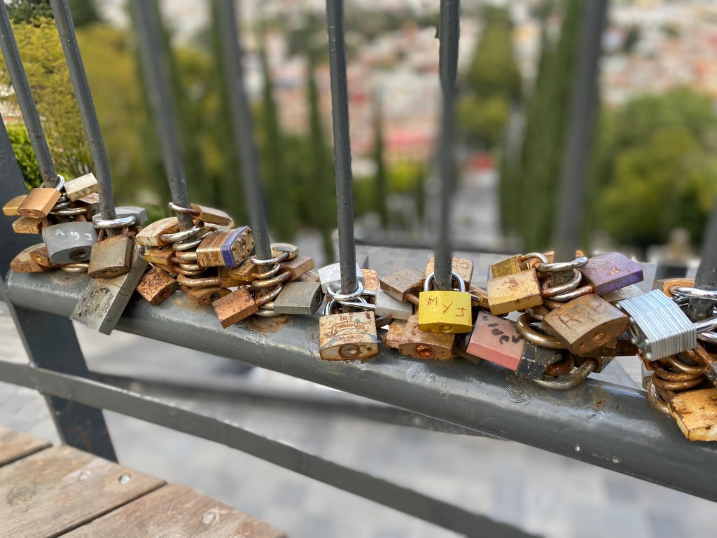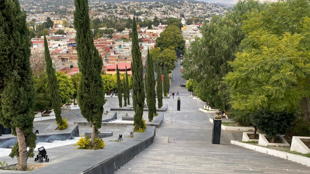 Weiter ging es dann zu einem weiteren Punkt in der Stadt den wir uns auf jeden Fall anschauen wollten: Die Treppe der Helden, früher auch Unabhängigkeitstreppe genannt (spanisch: Escalinatas de los Héroes). Diese im Jahr 1960 errichtete Treppe, dessen obere Plattform als Aussichtspunkt über die Stadt genutzt wird, besteht aus insgesamt 250 Stufen und wurde zu Ehren der Nationalhelden der mexikanischen Unabhängigkeit und der mexikanischen Revolution errichtet. Auf den kleinen Zwischenebenen des Denkmals befinden sich Statuen wichtiger Persönlichkeiten der Zeit der Revolution. Ähnlich wie auf einigen Brücken europäischer Städte findet man oben am Geländer der Aussichtsplattform mehrere Hundert Vorhängeschlösser auf dem Namen von Paaren oder auch kleine Nachrichten eingeritzt sind. Wir haben die Treppe im Laufe des Tages zweimal besucht: Einmal bei Tageslicht, um einen Blick über die Stadt zu bekommen, und einmal bei Nacht, da die gesamte Treppe bei Dunkelheit von grünen Lichtern ausgeleuchtet wird. Der Ausblick auf die Stadt von dort oben ist wirklich schön und man kann wirklich weit schauen.