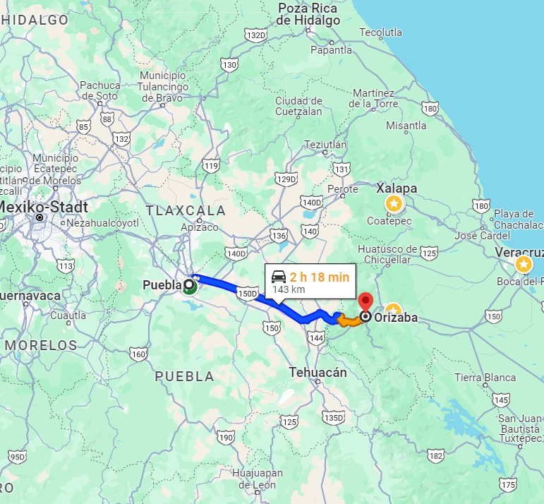 Nach unserer Tour nach Tlaxcala am 26.12.23 haben Estefania und ich uns erstmal einen Tag Ruhe gegönnt bis wir zu unserem nächsten Trip aufgebrochen sind. Da ich die Gelegenheit nutzen wollte von Puebla aus, wo ich die Zeit von Weihnachten bis Neujahr verbracht habe, noch mehr Staaten rings um Puebla zu besuchen, haben wir uns dazu entschieden eine kleine Rundtour durch den Bundesstaat Veracruz zu machen. Dieser liegt westlich von Puebla und hat eine 1000 km lange Küste am Golf von Mexiko. Insgesamt wollten wir in 3 Tagen die Städte Orizaba, Córdoba, Veracruz und Xalapa besuchen. Die Städte Orizaba und Cordoba wollten wir an einem Tag besuchen, da sie so nach beieinander liegen. Für Veracruz und Xalapa planten wir jeweils einem Tag ein.