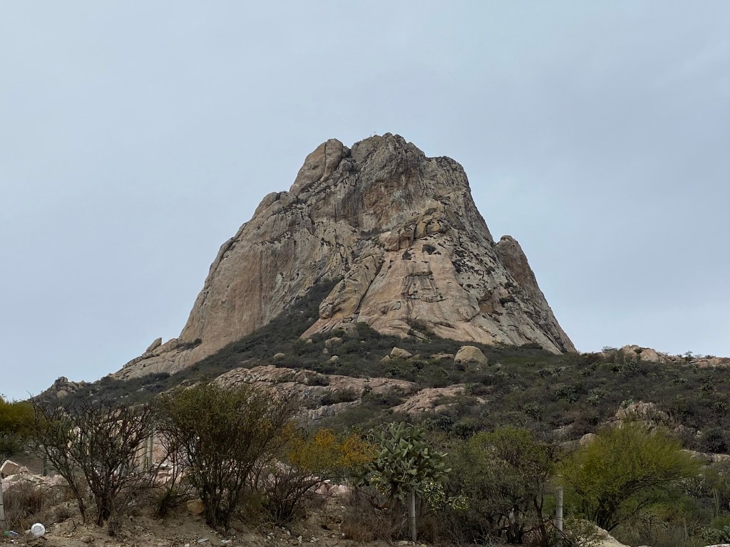 Als erstes ging es für mich am 30.01.24 in das Pueblo Magico Santiago de Bernal. Bernal ist ein sehr kleines Örtchen und das Highlight in Bernal ist der Monolith Pena de Bernal. Mit 360 Metern ist er nach dem Felsen von Gibraltar in Spanien und dem Zuckerhut in Brasilien der drittgrößte Monolith der Welt. Da ich es vorher auch nicht wusste: Das Wort Monolith kommt aus dem altgriechischem und bedeutet soviel wie “einheitlicher Stein” und beschreibt einen nur aus einer Gesteinsart bestehenden Felsbrocken.