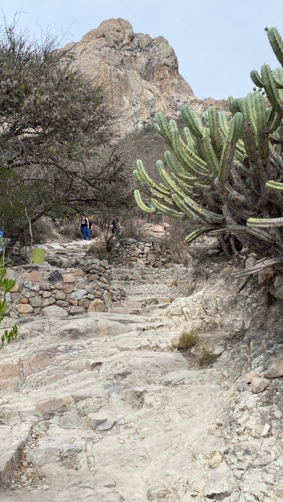 Der Eintritt zum Aufstieg des Berges kostet circa 80 Pesos und bereits während des Aufstiegs hat man eine schöne Sicht auf Bernal. Ich würde hier auf jeden Fall festes Schuhwerk empfehlen, da der Pfad eigentlich kaum befestigt ist und man auf vielen Felsbrocken herumlaufen muss. Ich hatte zum Glück meine relativ festen Wanderschuhe dabei.