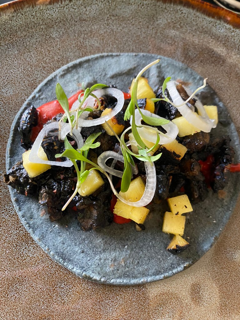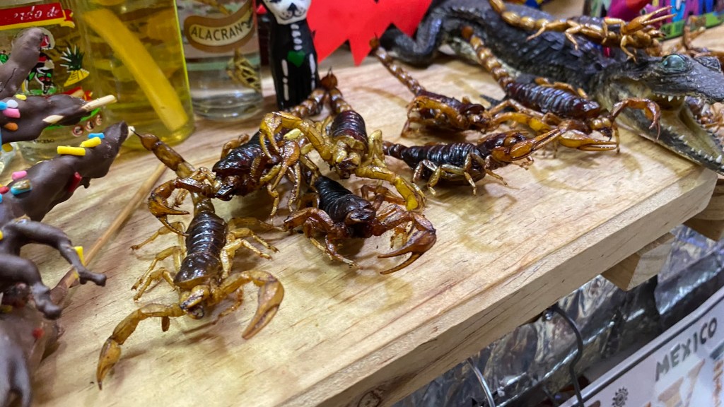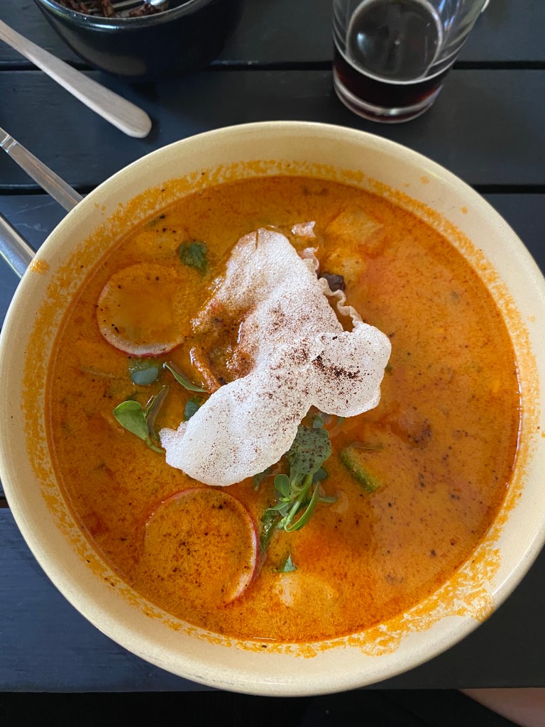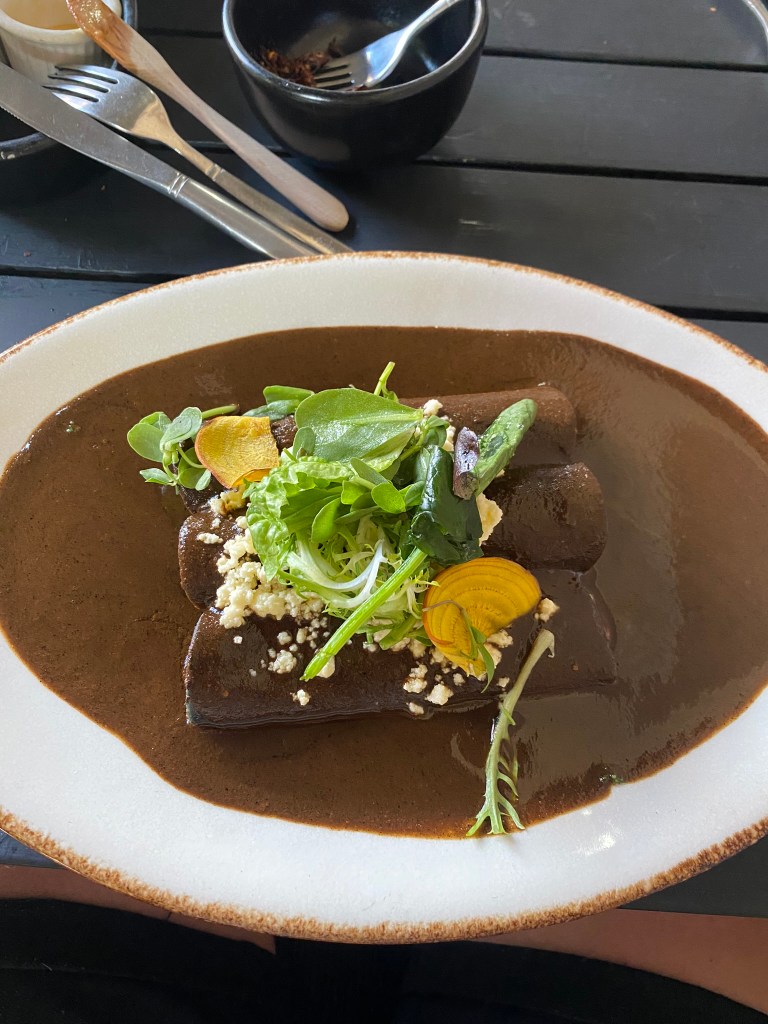 Den Namen habe ich leider vergessen, aber es war ein etwas schickeres Restaurant in Condesa. Nils bestellte für uns eine Portion Chapulines, die kleinen Insekten, die ich bereits in Oaxaca probierte, damit die anderen beiden das auch mal probierten. Ich glaube sie waren nicht allzu sehr überzeugt. Die anderen Speisen dieses Restaurants mit Gerichten aus Oaxaca waren wirklich sehr sehr gut. Ich bestellte mir einen Taco Negro. Das Besondere an diesem war, dass hier so kleine schwarze Käfer drin sind. Ihr könnt sie auf dem Bild sehen. Die kleinen schwarzen Dinger mit den hellen Punkten drauf. Dazu gab es noch Pozole, eine traditionelle Suppe mit Mais und Hähnchenfleisch und als Hauptspeise Enchiladas mit Mole.