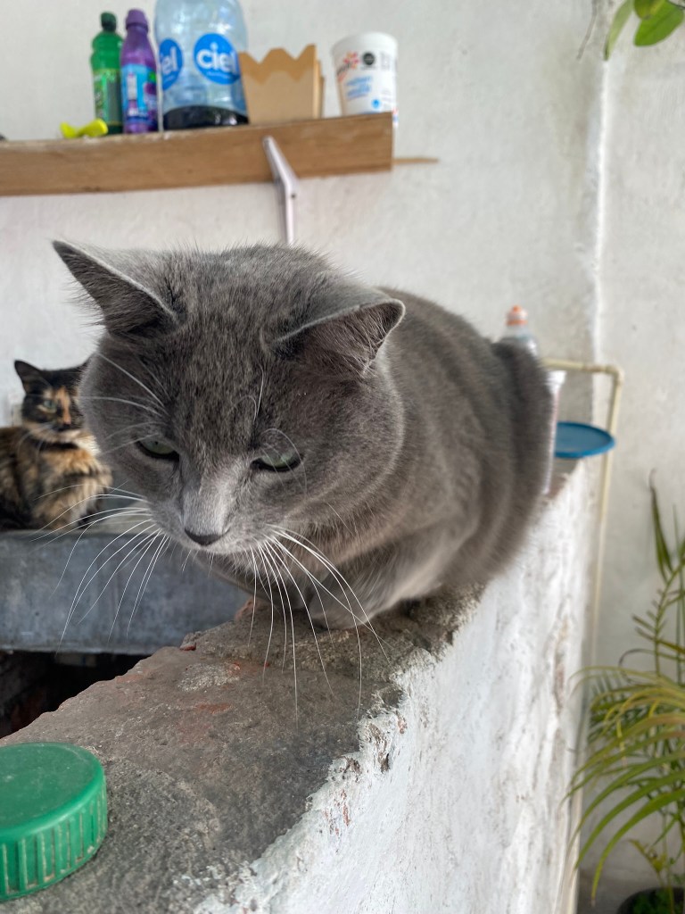 Die Katzen hatten alle sehr unterschiedliche Charaktere. Gris zum Beispiel war sehr zutraulich wohingegen Fiona, die Schwanger war, häufig Abstand gesucht hat. Aber lieb waren sie alle. Ich bin fast jeden Morgen nach dem Aufstehen in den Innenhof gegangen und habe etwas Zeit mit den Hunden und Katzen verbracht, damit sie sich etwas an mich gewöhnen und außerdem waren sie so zutraulich. Ich hatte alle sehr lieb.
