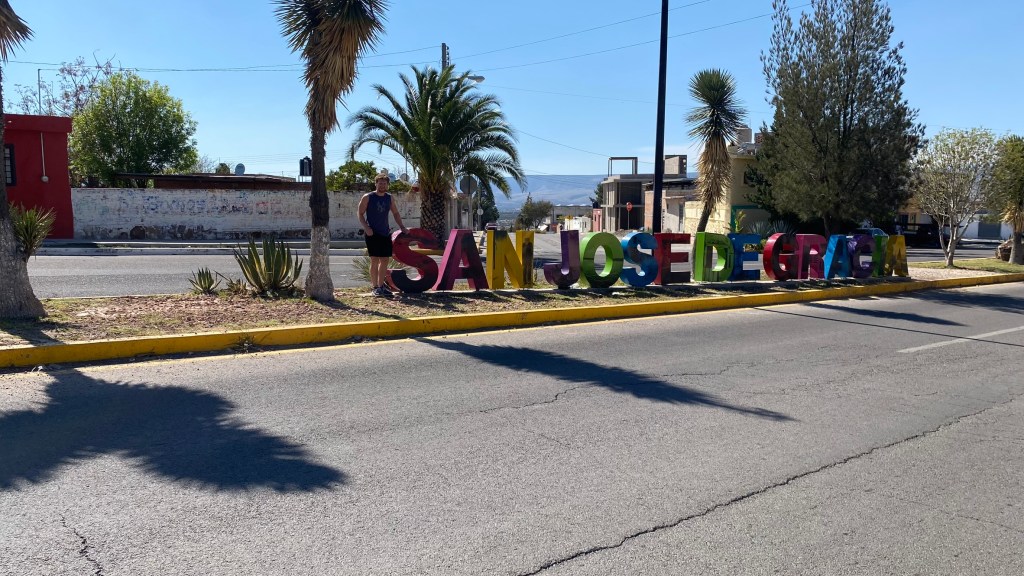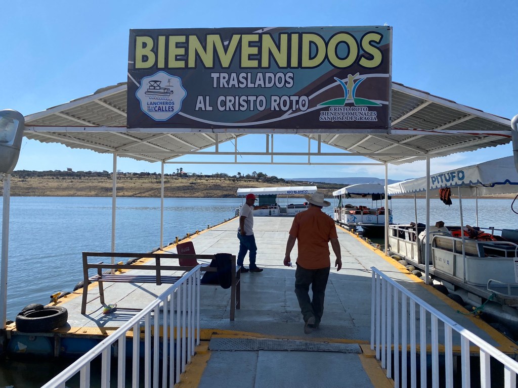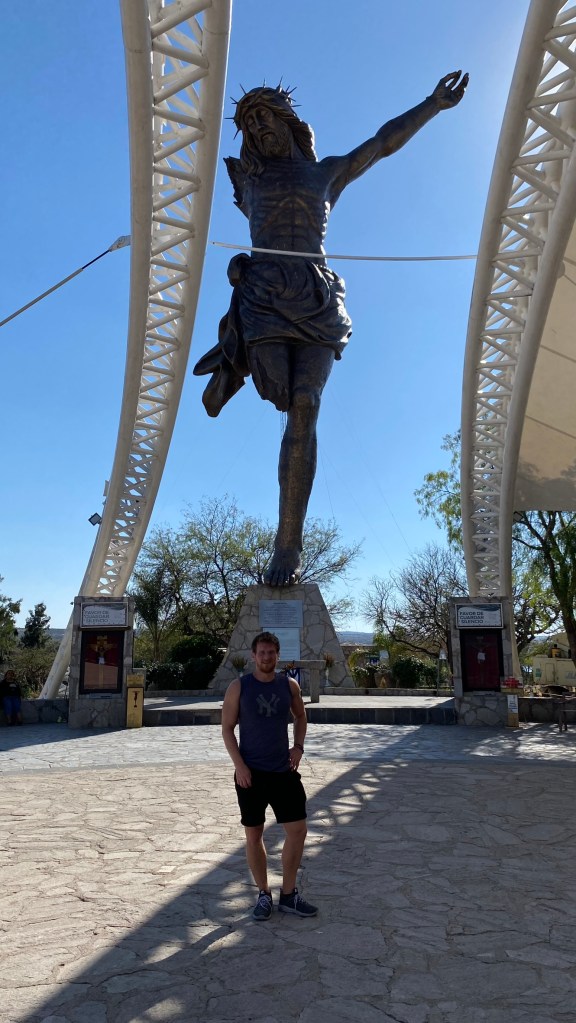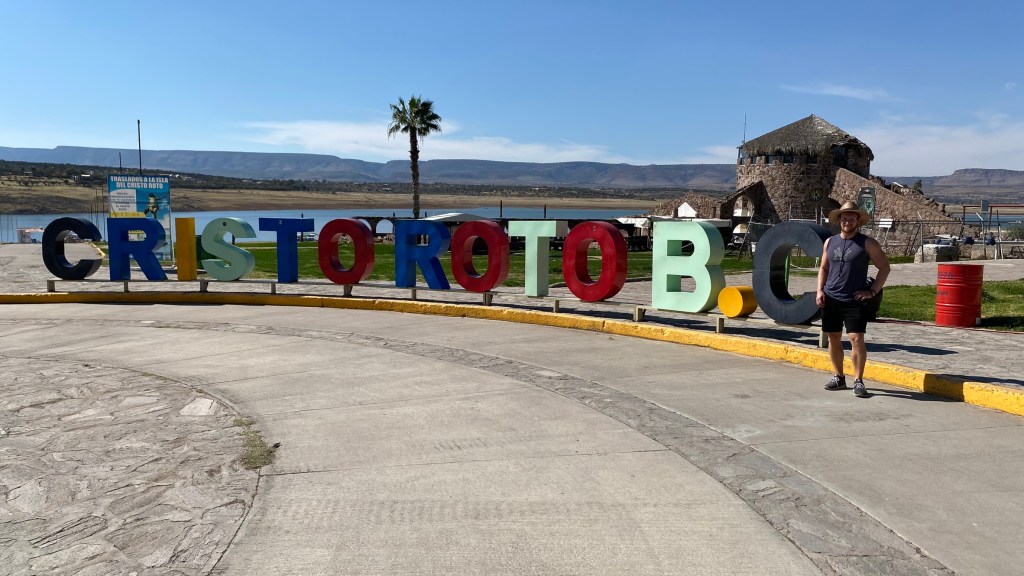 Gleich am nächsten Tag nach meiner Ankunft hatten Luciano und Amanda schon unseren ersten Ausflug geplant. Wir fuhren nach einem gemeinsamen Frühstück in das Pueblo Magico San Jose de Garcia. In der Nähe dieses Örtchens befindet sich nämlich eine ganz besondere Statue, und zwar der Cristo Roto (gebrochener Christus). Diese 28 Meter hohe Statue von Jesus Christus befindet sich etwas außerhalb der Ortschaft auf einer Insel inmitten des Staudamms Plutarco Elias Calles und wurde nach 2 Monaten Bauzeit im Jahr 2006 fertiggestellt. Das Besondere an dieser Statue ist, dass ihr das rechte Bein und der rechte Arm fehlt. Dies soll an die menschliche Gebrechlichkeit erinnern.