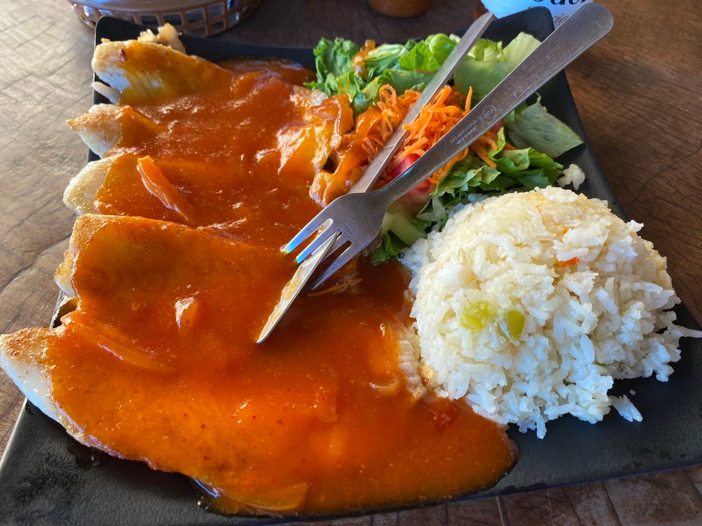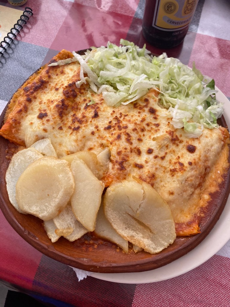 Ich habe mir natürlich die Spezialität des Hauses bestellt. Die Enchiladas waren superlecker und auch mein kleiner Kuchen, den ich mir zum Nachtisch bestellte war sehr gut. Auch preislich war das Restaurant empfehlenswert. Die Hauptspeisen kosten hier zwischen 100 und 150 Pesos und man wird von der Portion auf jeden Fall satt. Ich konnte nachvollziehen, warum wir hier hergekommen sind.