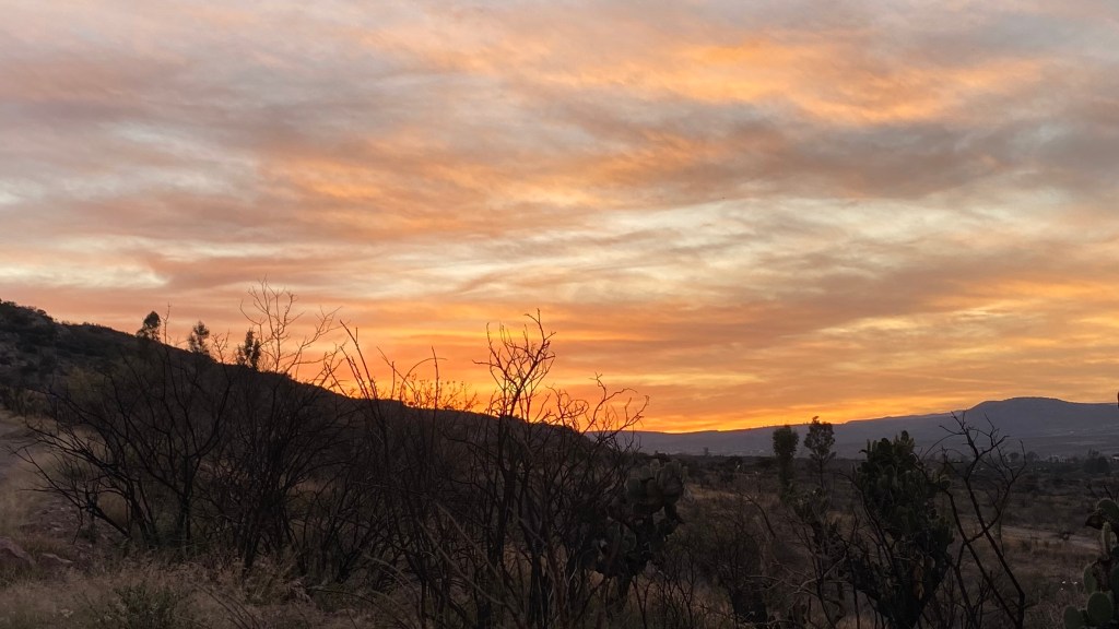 Wir machten uns anschließend zurück auf den Weg nach Aguascalientes. Kurz vor Ortseingang machten wir allerdings noch einen kleinen Stopp. Und zwar wollten wir noch zum Cerro Picacho oder auch Cerro del Muerto gehen. Das ist ein kleiner Hügel von dem aus man einen schönen Blick auf den Sonnenuntergang hat. Wir kamen hier bereits zu später Stunde an und sind daher nicht ganz auf den Hügel gewandert, da das bestimmt noch einmal mindestens 1.5 Stunden gedauert hätte. Wenn man den Sonnenuntergang vom Hügel aus sehen möchte, sollte man also schon zeitig aufbrechen. Wir gingen am Fuß des Hügels ein paar 100 Meter hinauf und konnten noch die letzten Momente des Sonnenuntergangs genießen. Und dieser war sehr schick, vor allem mit dieser Kulisse. Mir ist allgemein aufgefallen, dass die Sonnenuntergänge hier häufig sehr schön sind. Das kannte ich bisher nur aus den Küstenorten.