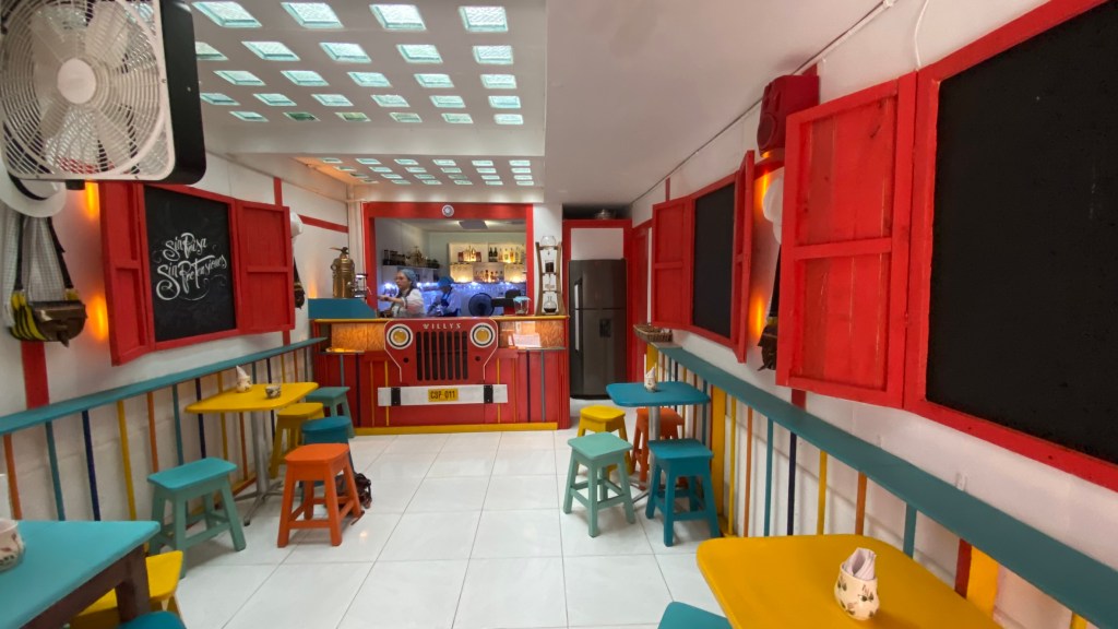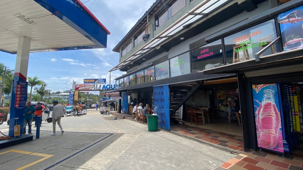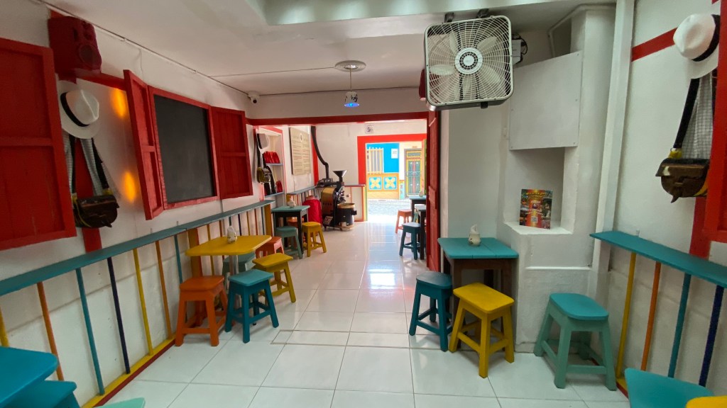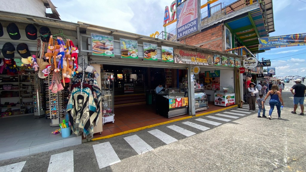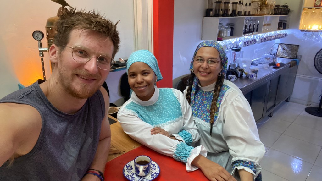 Es dauerte nur ein paar Minuten, da rief auch schon eine nette Dame aus einem kleinen Café zu mir rüber, ob ich nicht einen Kaffee haben möchte. Ihr könnt sie sogar hinten auf dem rechten Bild schon sehen. Ich sagte natürlich zu. Im Café sin P begrüßten mich zwei Damen in einer traditionellen Tracht. Als sie bemerkten, dass ich spanisch spreche, waren sie ganz glücklich und fragten mich regelrecht nach meiner Reise aus. Ich erzählte den beiden natürlich gerne, wo ich mich bisher so rumtrieb. Yamile und Yalimar sind Freundinnen und kommen beide aus Venezuela. Hier in Guatapé haben sie sich einen Wunsch erfüllt und ein Café eröffnet. Und das meiner Meinung nach mit Erfolg, denn der Café war sehr gut und auch die traditionellen Backwaren, die sie anboten, waren sehr gut. Wenn ihr in Guatapé seid, stattet den beiden auf jeden Fall einen Besuch ab. Sie werden euch mit offenen Armen empfangen und euch einen klasse Kaffee servieren.