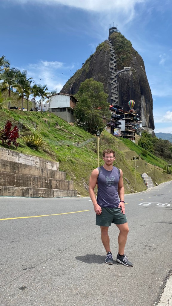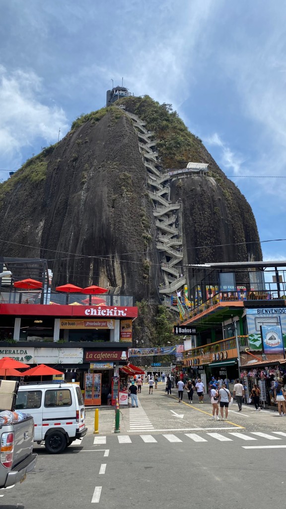 Ich kaufte mir ein Ticket für 20.000 Pesos (5 Euro), nahm den Bus um 10:00 Uhr und machte mich auf die 2-stündige Reise nach Guatapé. Pünktlich um 12:00 Uhr kam ich dann auch an. Wenn man nach Guatapé kommt, hat man die Möglichkeit direkt am Fuße des Monolithen herausgelassen zu werden oder weiter in die Stadt zu fahren. In meinem Fall wies der Fahrer zumindest darauf hin, dass die nächste Station, die Station ist, welche sich am nächsten am Berg befindet. Dort stieg ich auch aus und begann meine Tagestour.