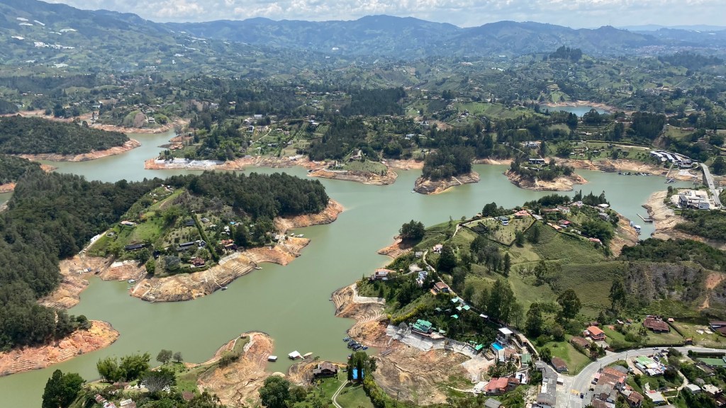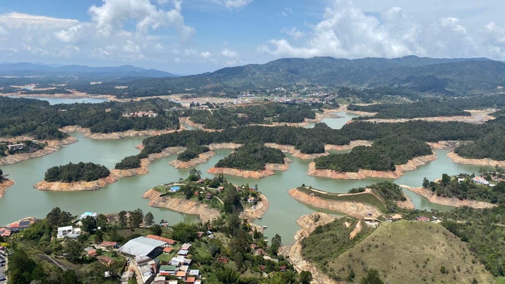 Der Stausee El Peñol-Guatapé entstand durch den Bau eines Staudamms am Fluss Guatapé in den 1970er Jahren. Der Damm wurde erbaut, um Wasser für die Energieerzeugung und Bewässerungszwecke zu speichern. Der Stausee erstreckt sich über eine Fläche von etwa 68 Quadratkilometern und bietet eine beeindruckende Wasserfläche, die von den umliegenden Bergen und Wäldern umgeben ist.