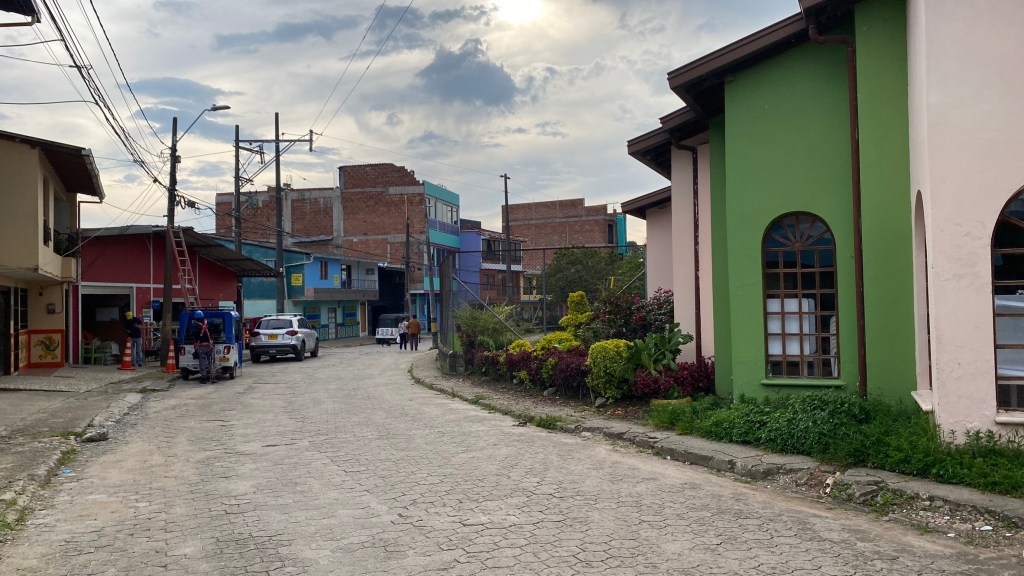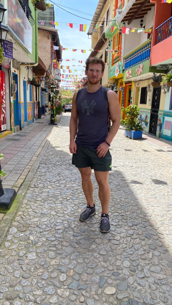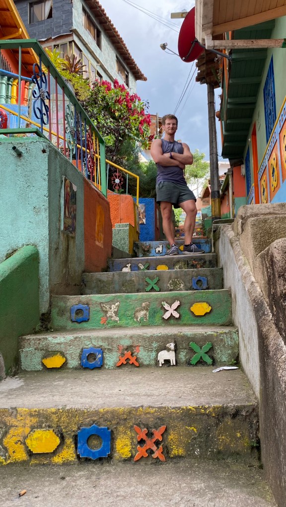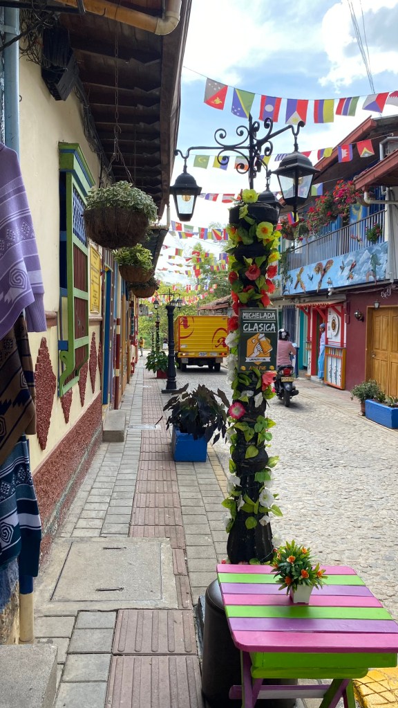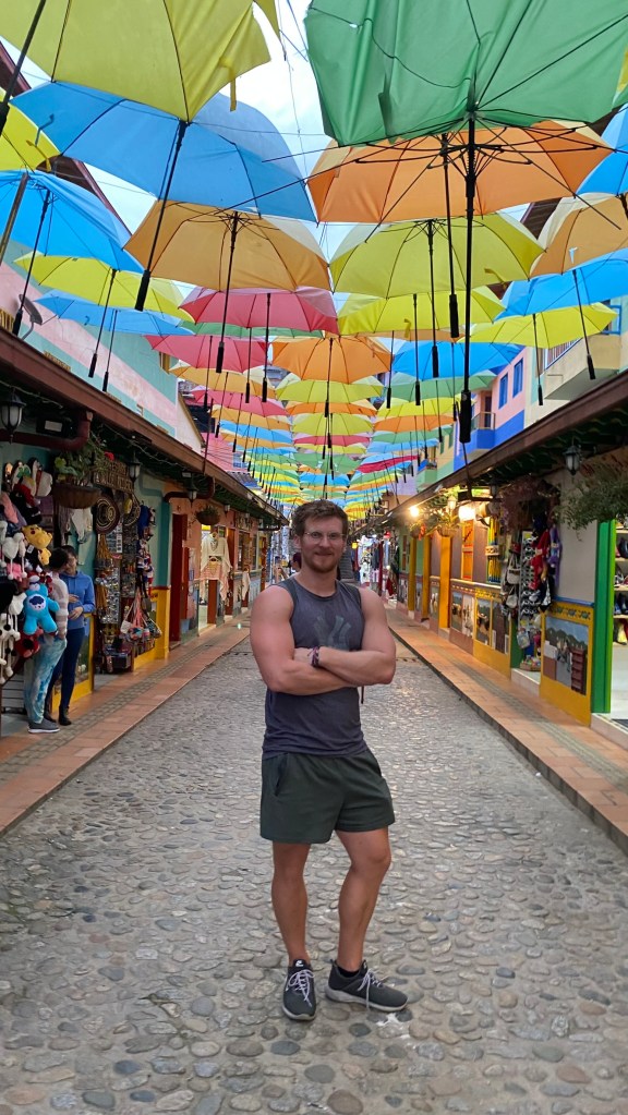 Danach begab ich mich langsam wieder in Richtung Dorf. Ich hatte jetzt noch insgesamt 2 Stunden bevor mein Bus nach Medellín abfuhr. Ich begab mich noch einmal ins Zentrum und besuchte einige Straßen, die ich bisher ausgelassen hatte. Dort entdeckte ich eine Gasse mit vielen aufgehängten Regenschirmen, die ich bereits auf Social Media während meiner Reisevorbereitung schon einmal gesehen hatte.
